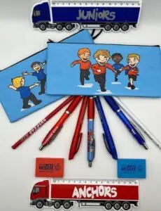 | Colour | Anchors Pencil Case, Juniors Pencil Case, Anchors Lorry Ruler, Juniors Lorry Ruler, Red Pencil, White Pencil, Anchors Pen, Juniors Pen, Red Rubber, Blue Rubber, Red Ball Pen, Blue Ball Pen, Red Twist Ball Pen, Blue Twist Ball Pen |