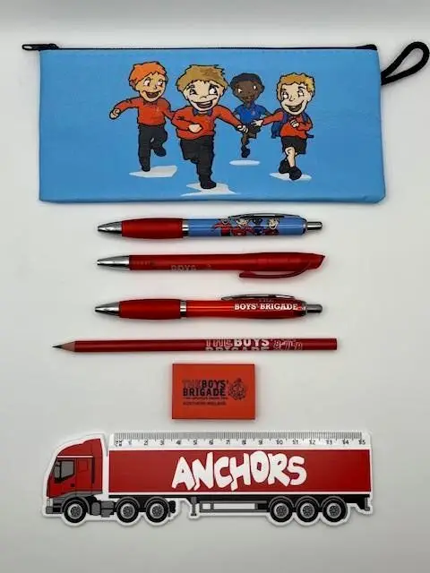 | Colour | Anchors Pencil Case, Juniors Pencil Case, Anchors Lorry Ruler, Juniors Lorry Ruler, Red Pencil, White Pencil, Anchors Pen, Juniors Pen, Red Rubber, Blue Rubber, Red Ball Pen, Blue Ball Pen, Red Twist Ball Pen, Blue Twist Ball Pen |